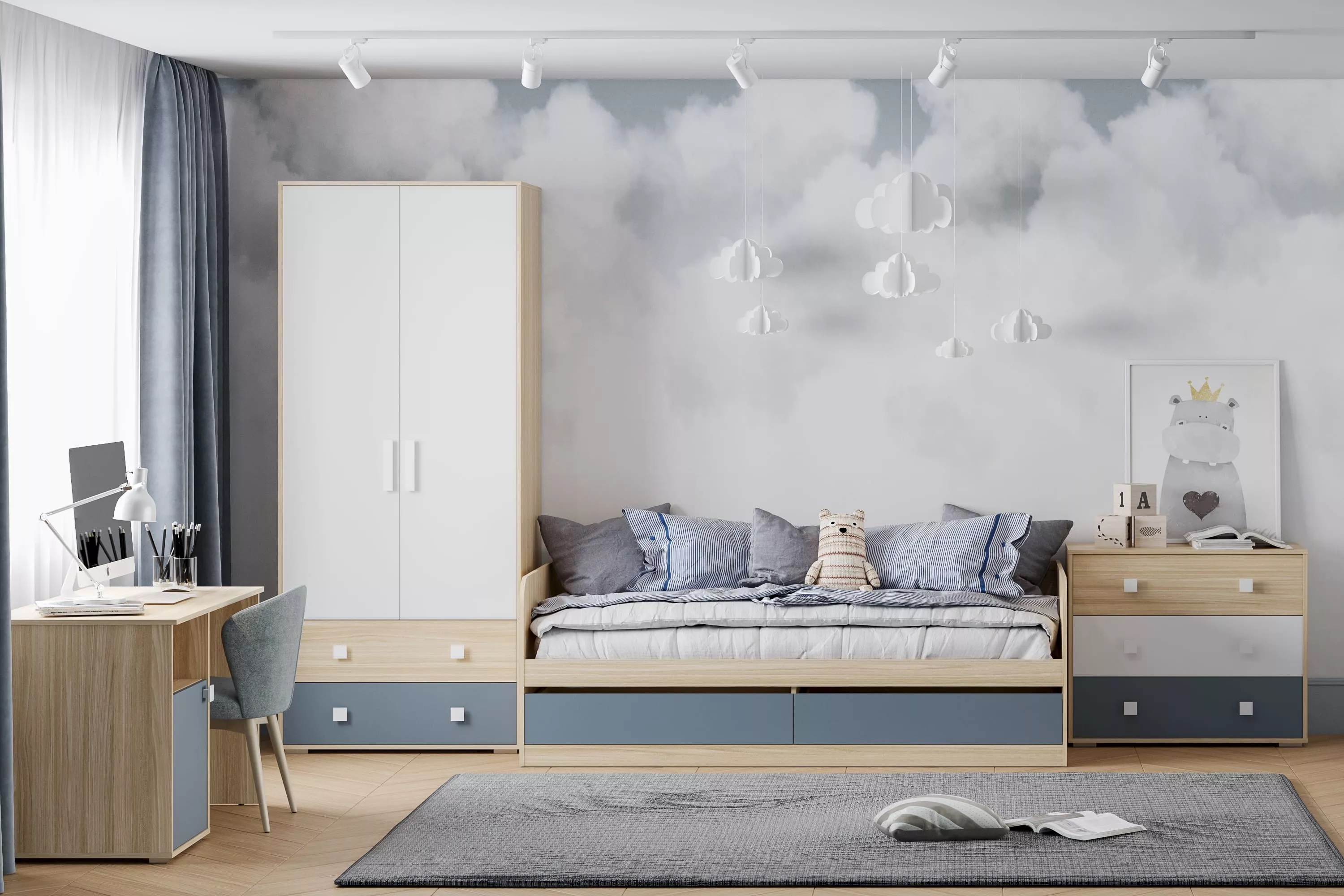 Комплектация №7 включает: кровать с выдвижными ящиками, в которых можно разместить постельное белье, письменный стол, а также шкаф с комодом для оптимизации хранения вещей.