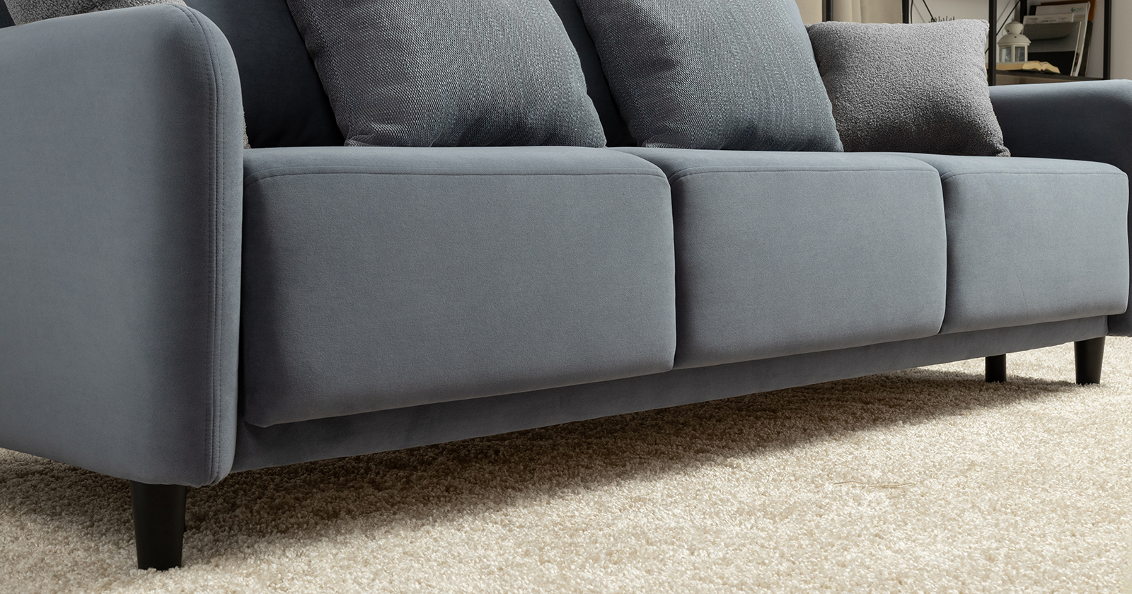 В комплекте 5 двусторонних приспинных подушки и 2 декоративные думки. Задняя спинка в ткани основы. Декоративные отделочные строчки по боковинам и сиденью