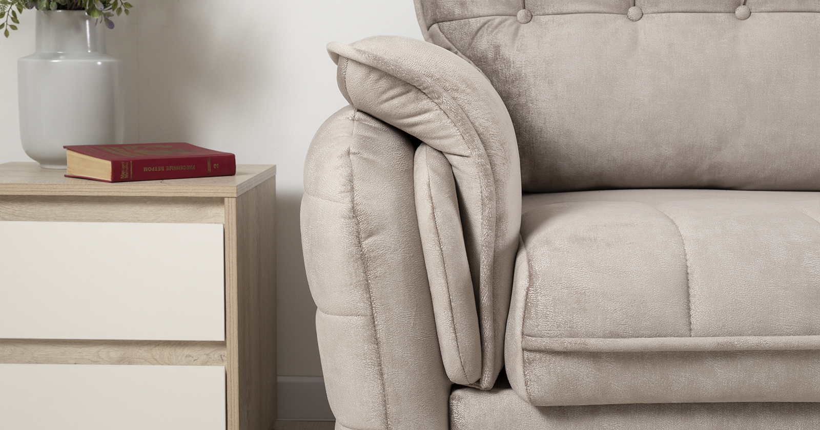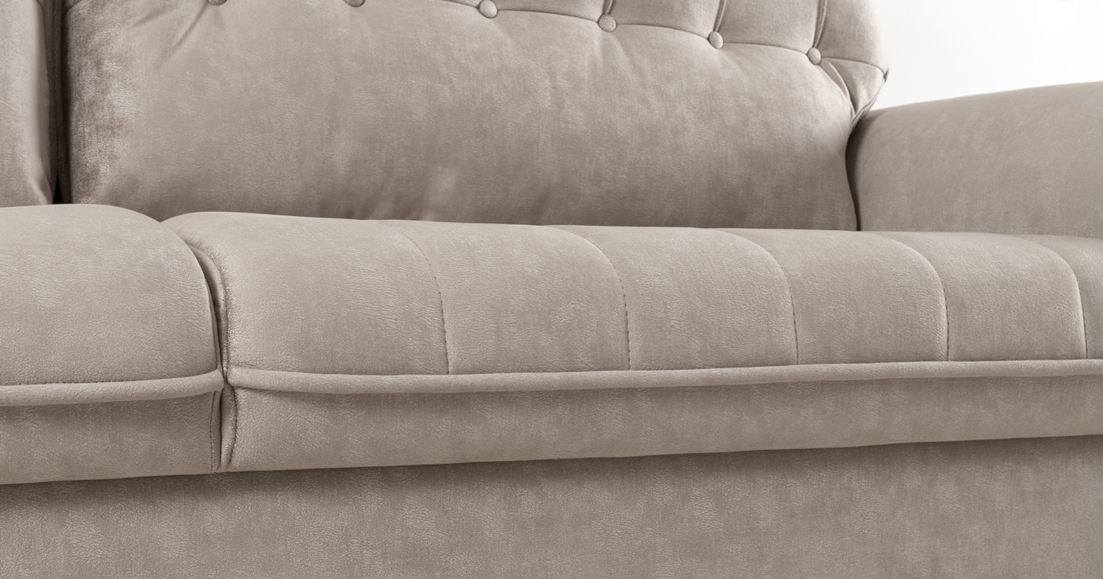 Декоративные канты на подушках дивана, подлокотниках и сиденье. Стежка на передней части сиденья и внешней части подлокотника. Защипы на верхней части подушки. Втяжки с пуговицами на приспинных подушках.