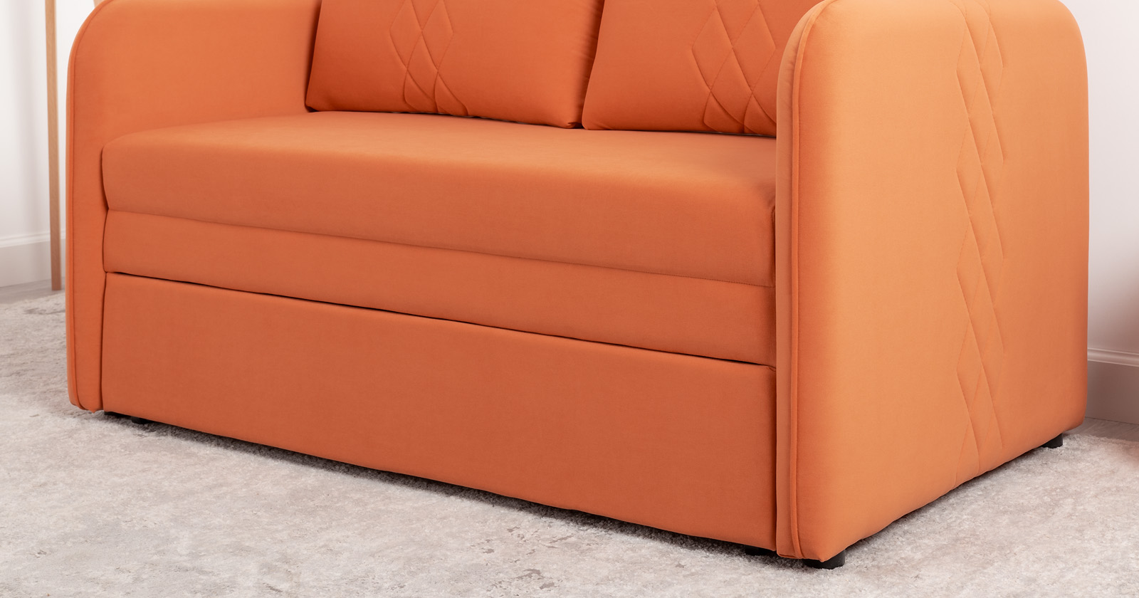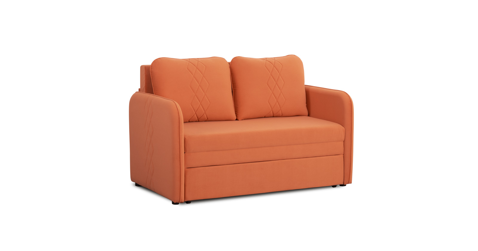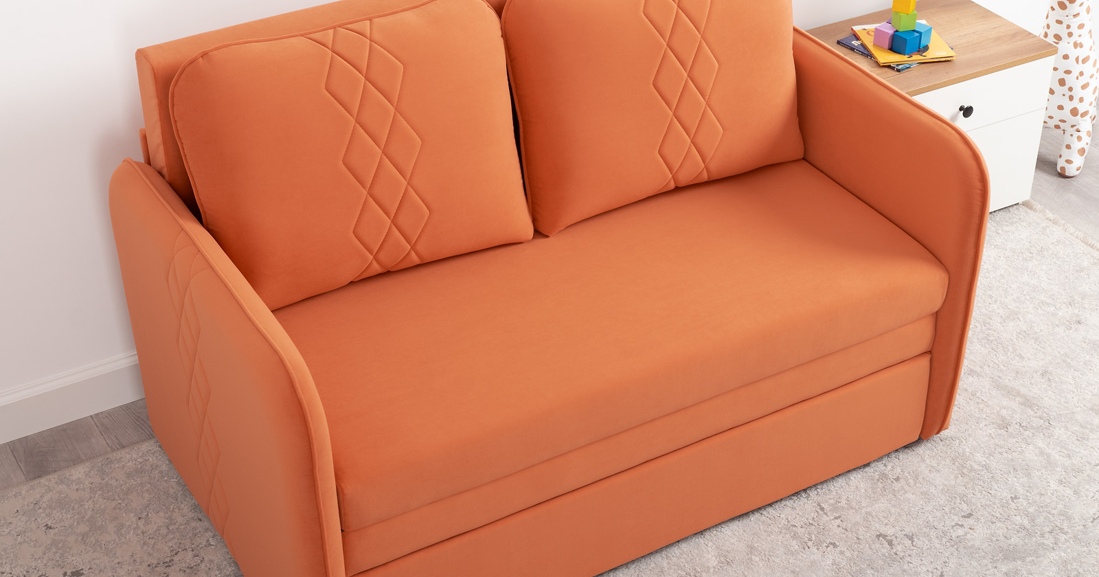 Стильный компактный диван для детской и гостиной. При своих скромных размерах он трансформируется в полноценное спальное место для детей и подростков. Лаконичный дизайн в виде декоративной стежки подчеркивает фактуру велюра, а небольшие размеры позволят разместить его в любом пространстве.
