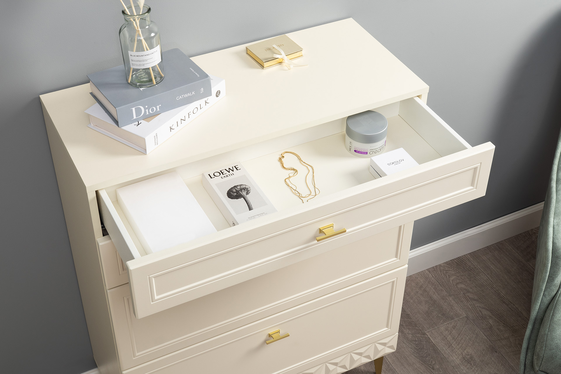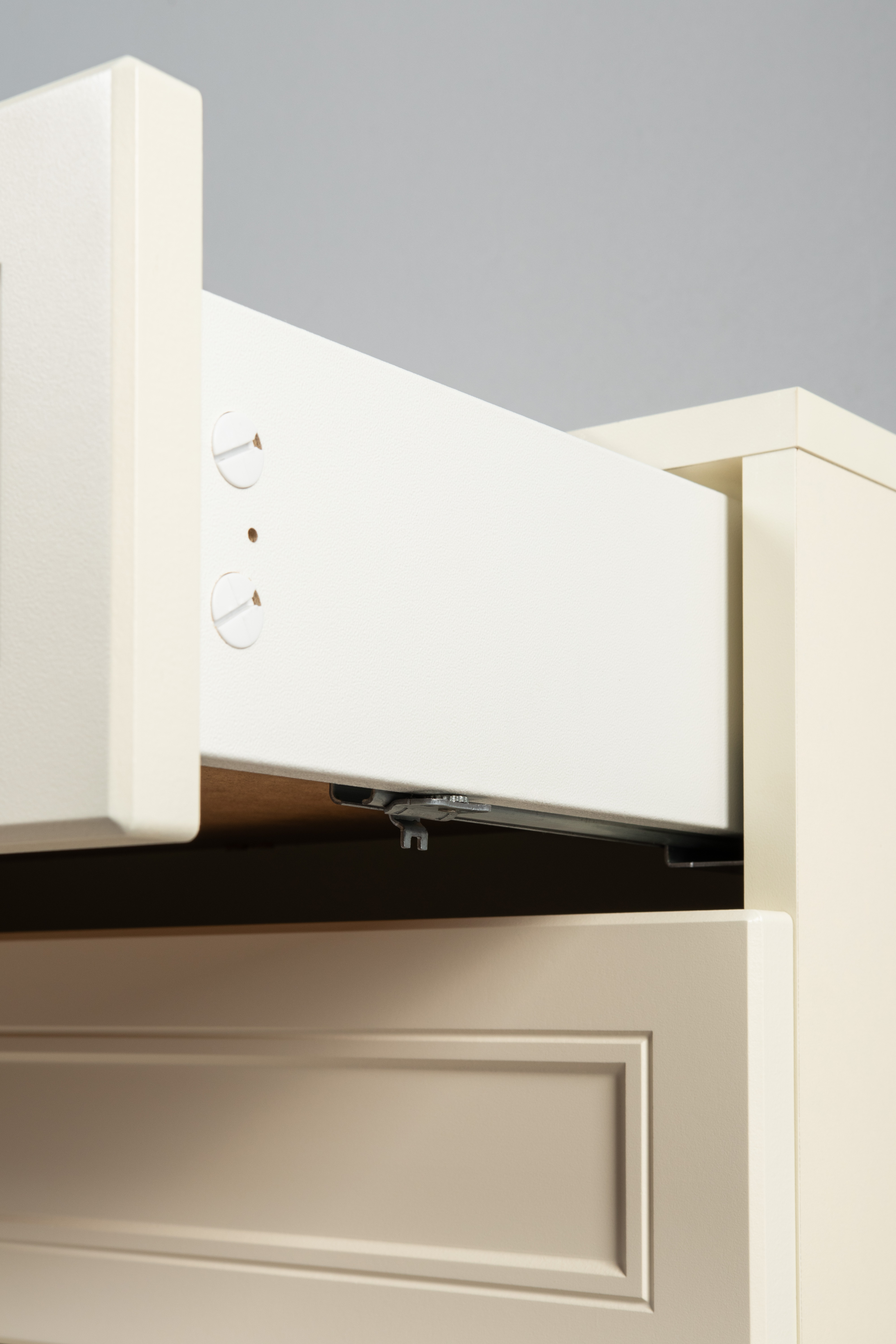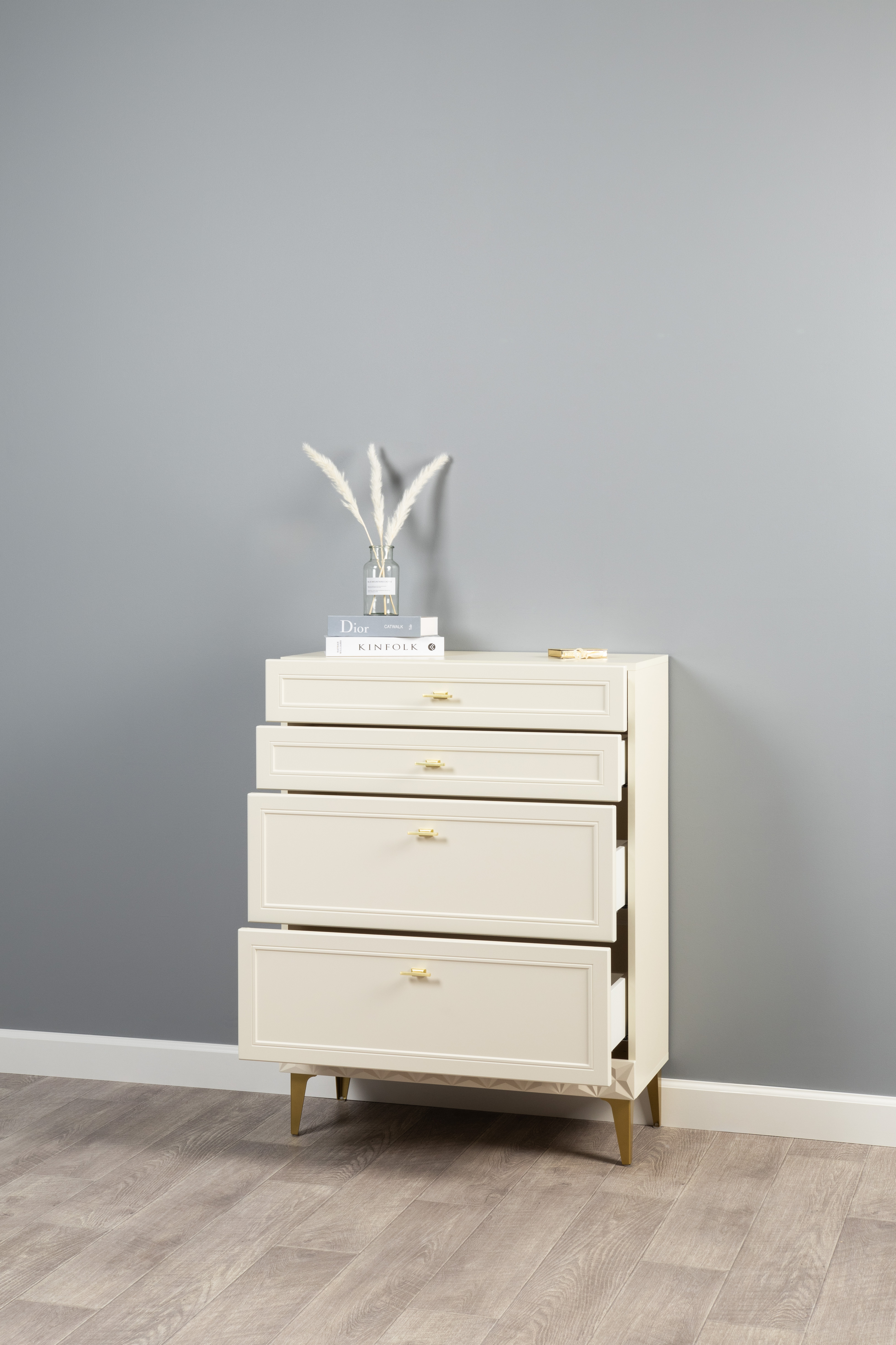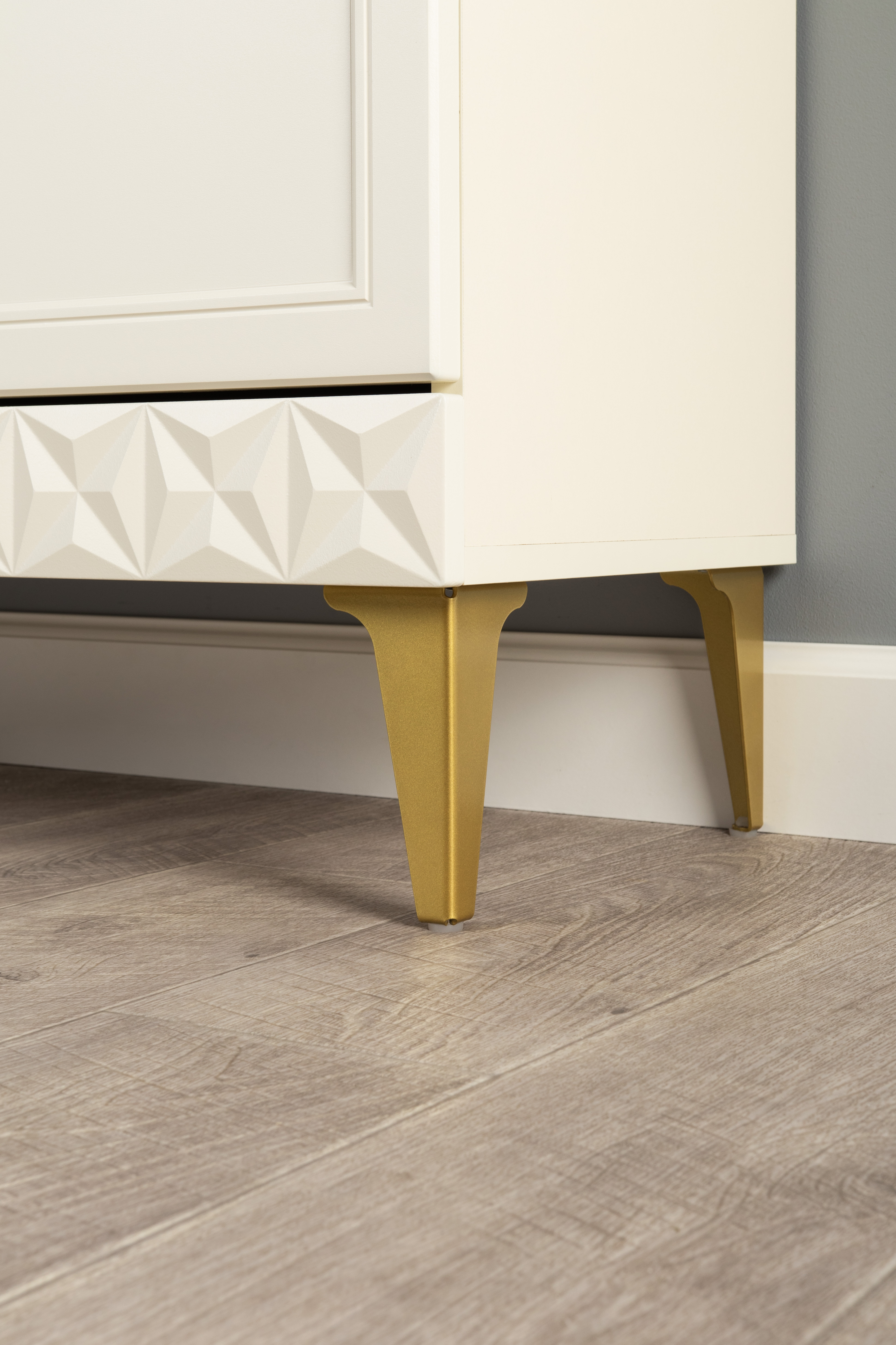 Изящные линии, глубокая фрезеровка фасадов из МДФ и благородные оттенки. Утончённая «Слоновая кость» и изысканная «Олива Шагрень» с глубоким зелёным тоном — создают атмосферу уюта, тепла и благородства. Металлические ручки и опоры золотого цвета придают мебели утончённый блеск, а петли и направляющие с доводчиками обеспечивают плавное и бесшумное закрытие фасадов.