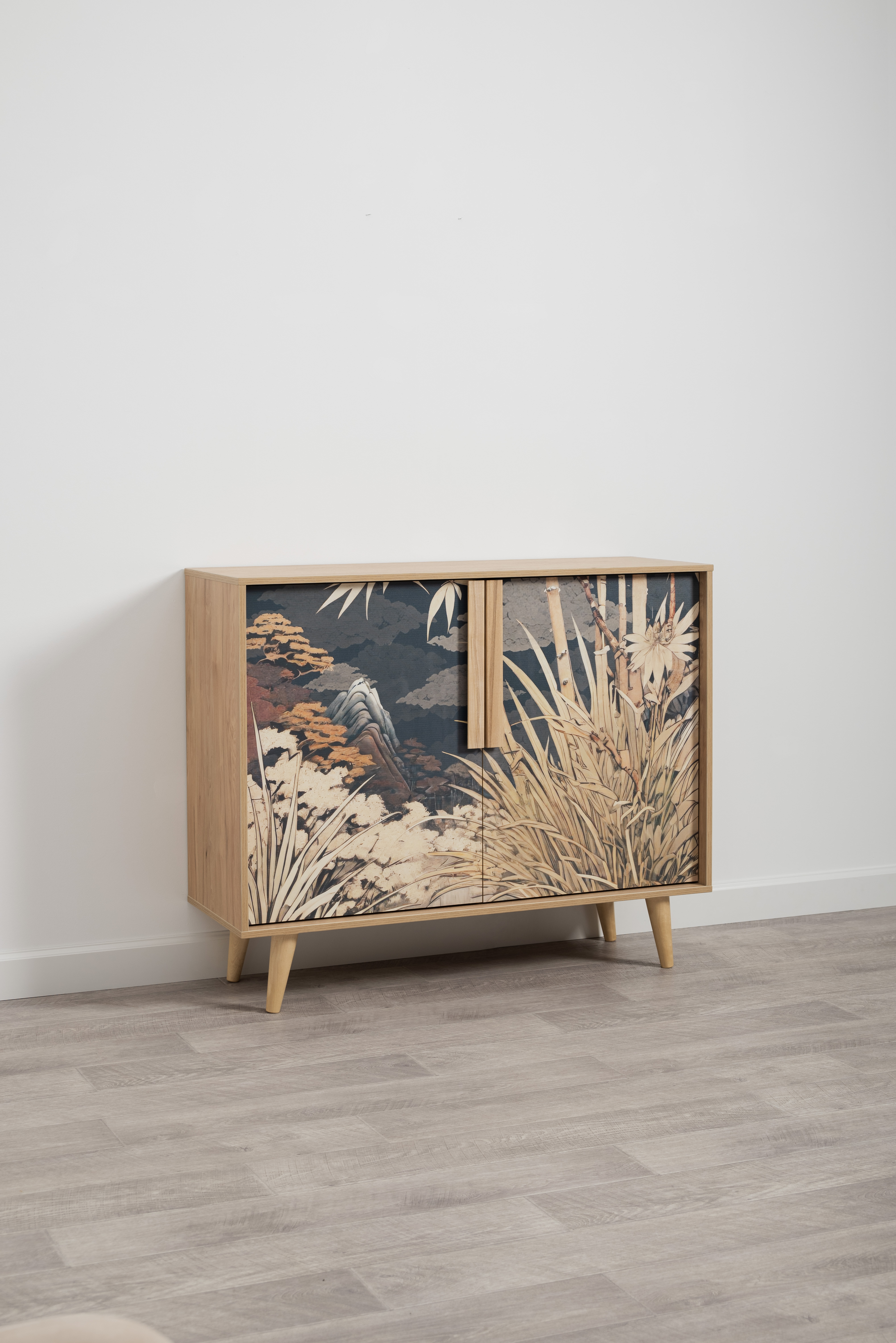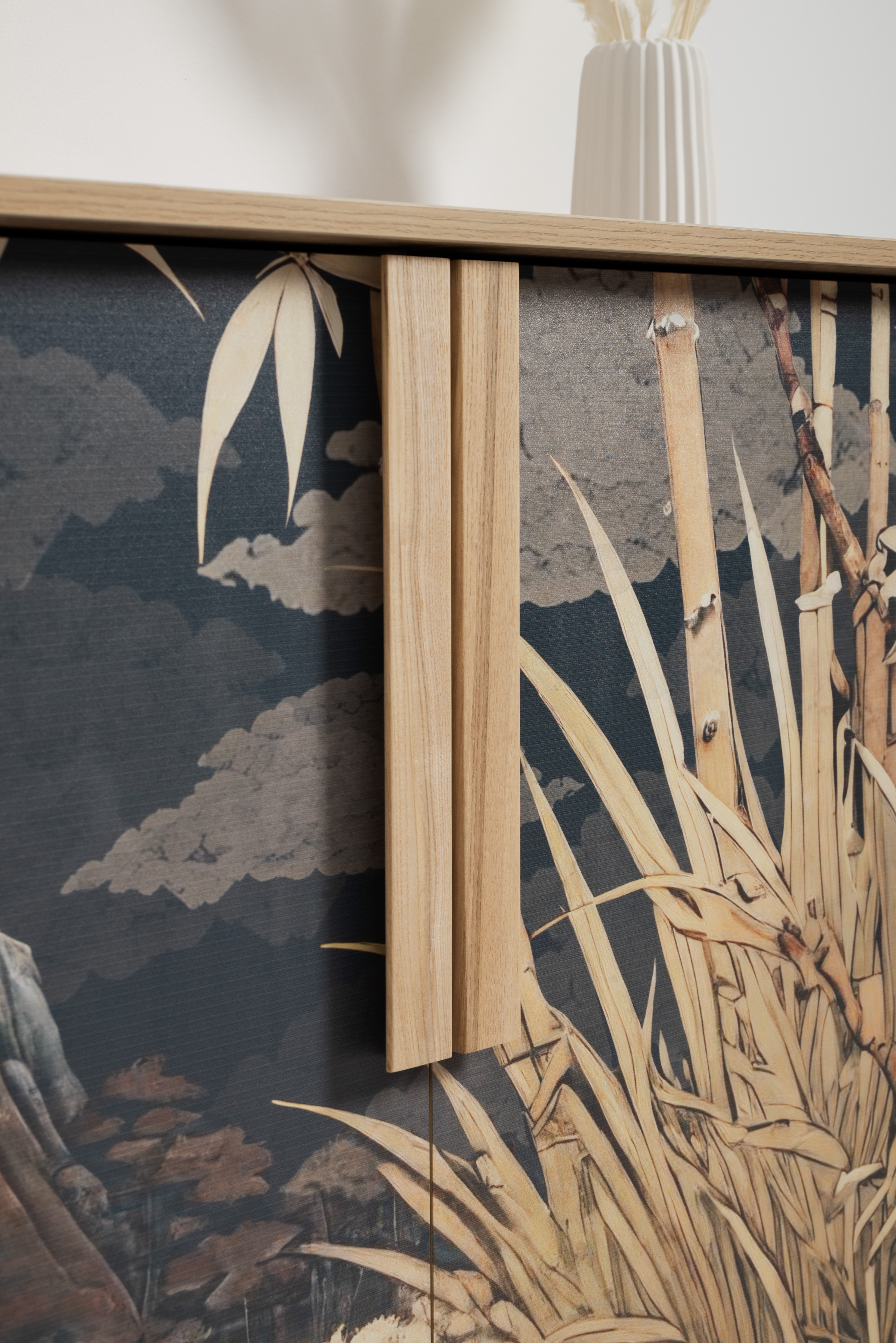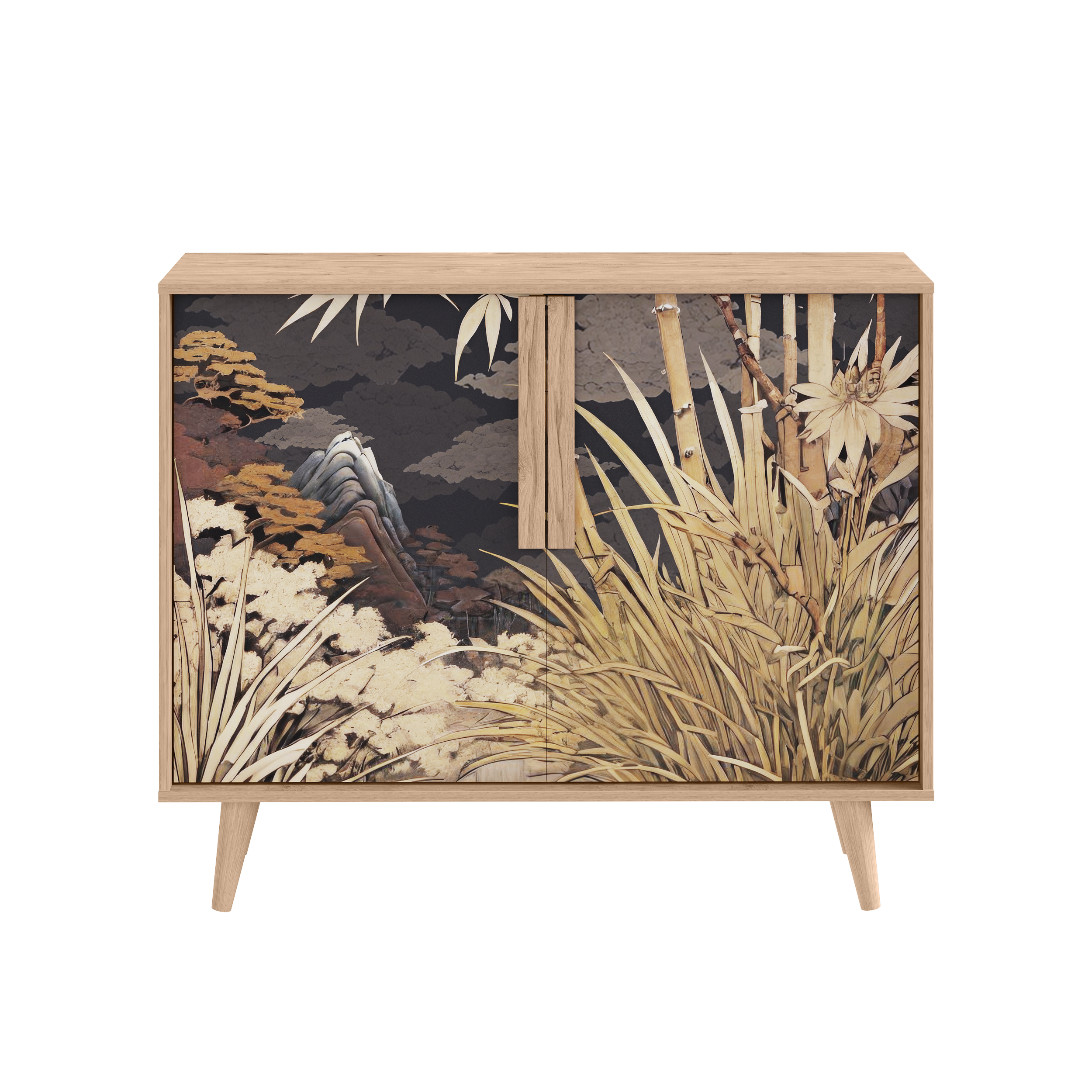 Комод Току 16.230.04 украшают фасады с фотопечатью в восточном стиле, и дополняют ручки и опоры из массива дерева. Вместительные отделения со съемными регулируемыми полками обеспечивают удобное хранение, а углубленные фасады придают конструкции стильную глубину.