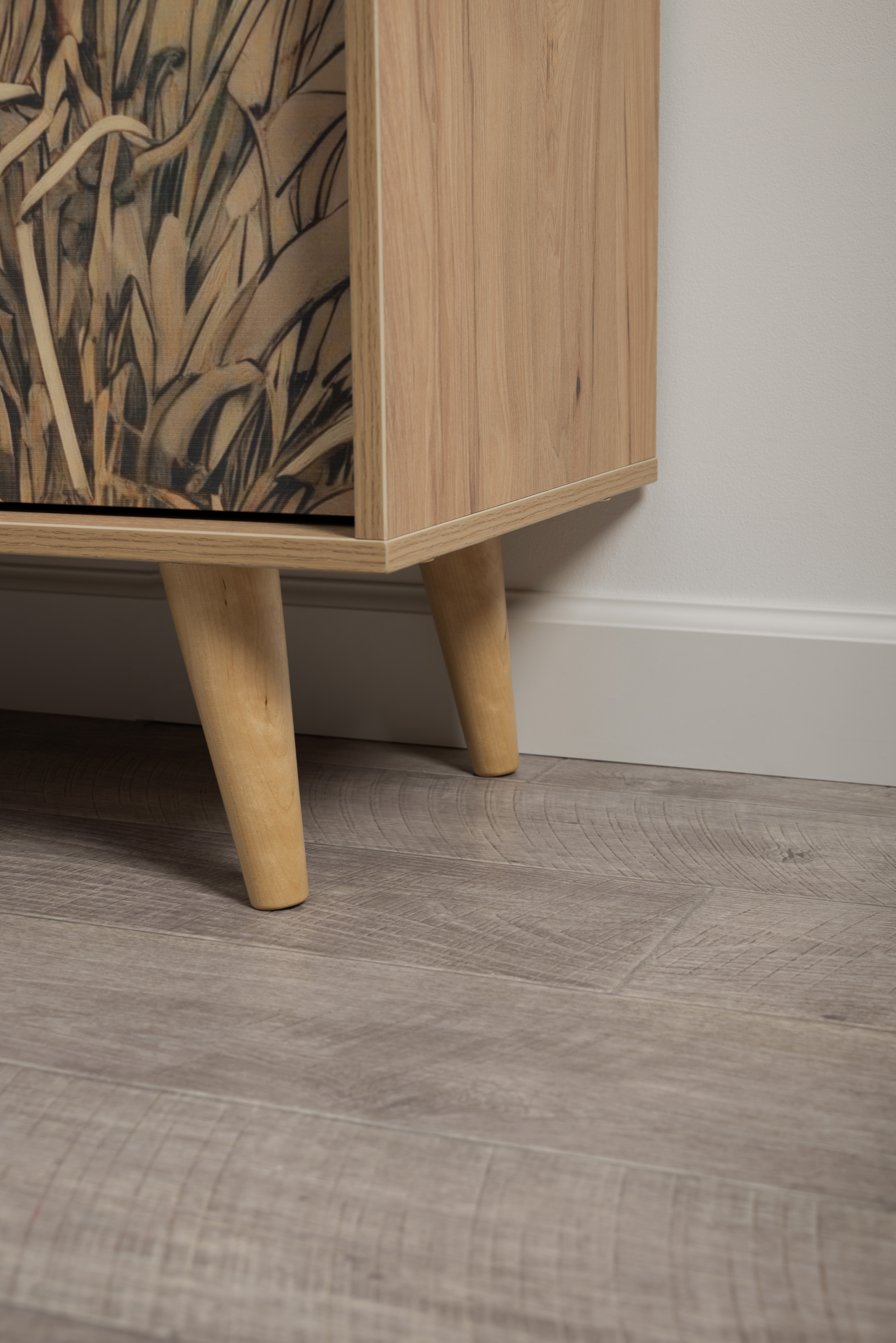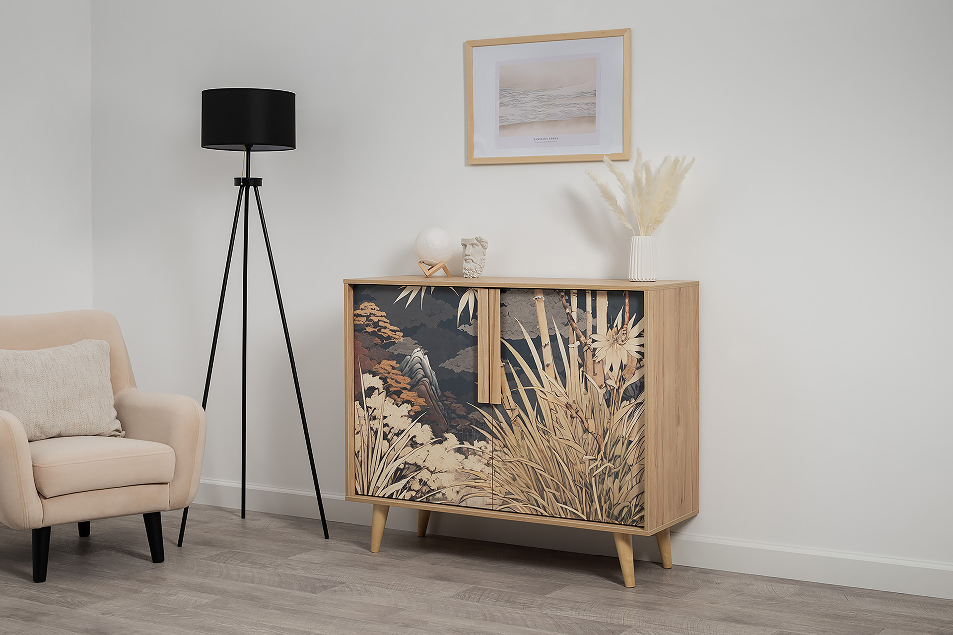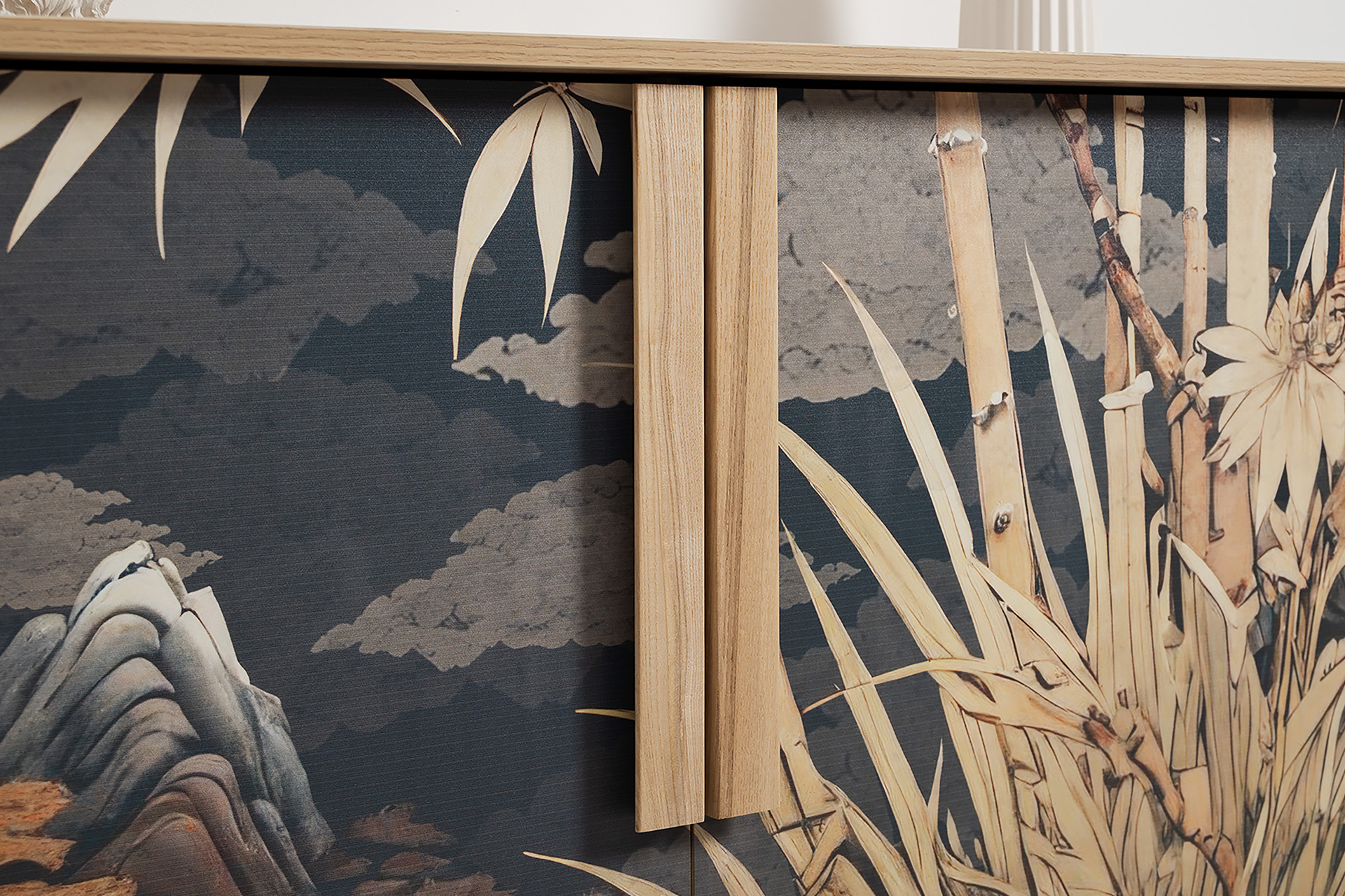 Комод Току 16.230.04 украшают фасады с фотопечатью в восточном стиле, и дополняют ручки и опоры из массива дерева. Вместительные отделения со съемными регулируемыми полками обеспечивают удобное хранение, а углубленные фасады придают конструкции стильную глубину.