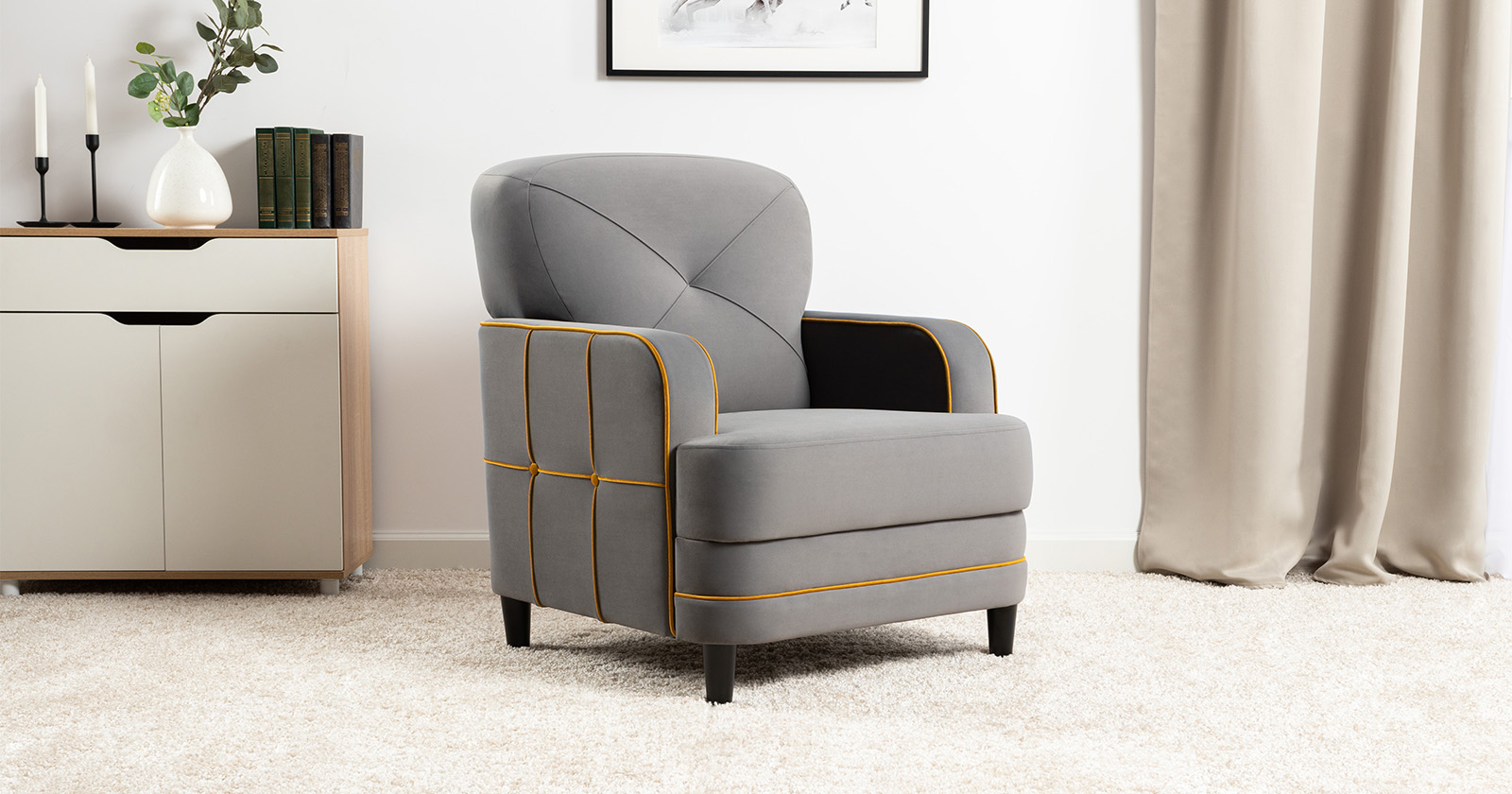 Декоративные канты на вставке подлокотников. Пуговицы в местах пересечения кантов на подушке и вставке подлокотников. По торцам подлокотников и думках контрастный декоративный кант. Защипы на сиденье и подушке.