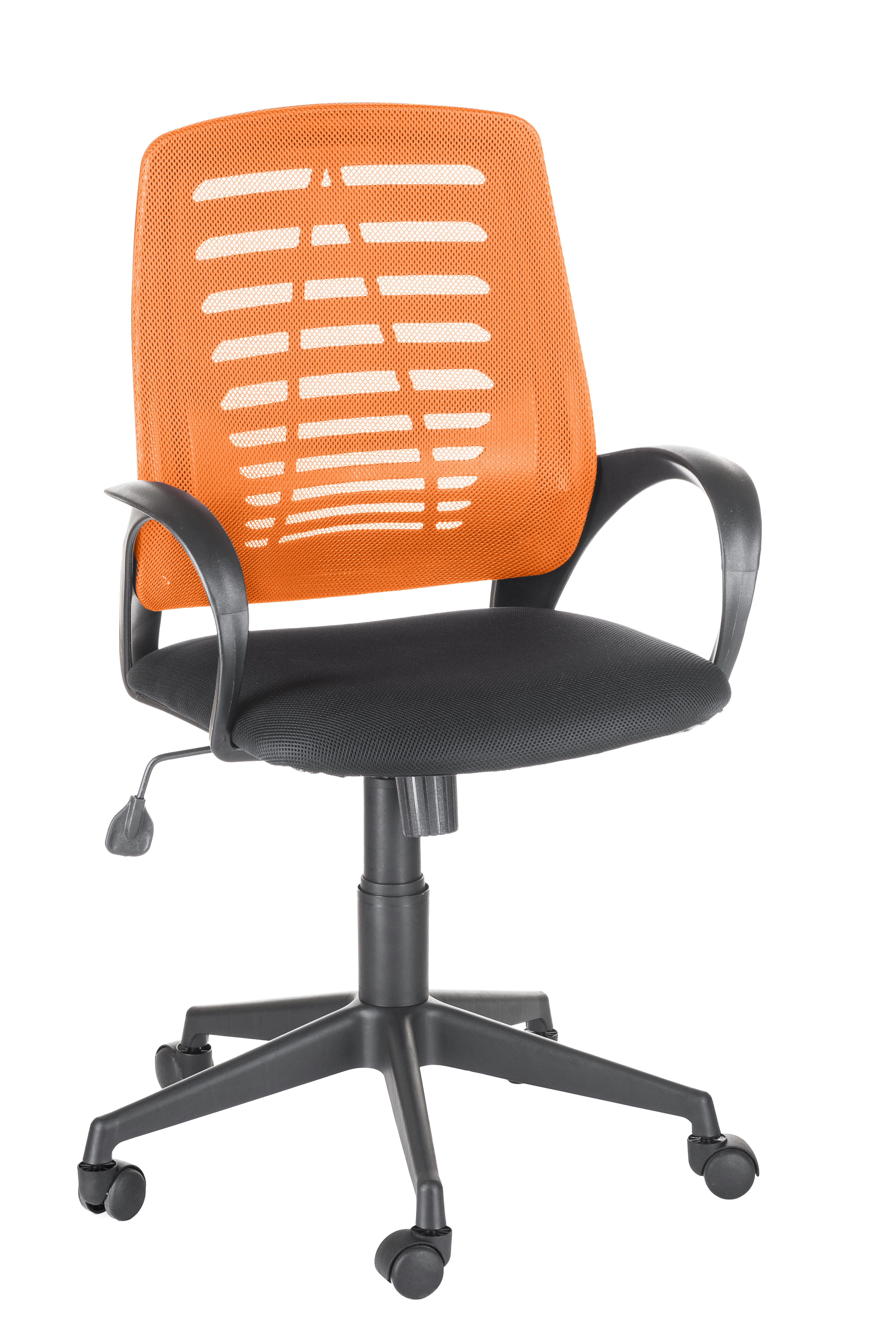 Кресло на колесах Ирис люкс обивка ткань-сетка TW сидушка черный, спинка оранж, подлокотники пластик, крестовина пластик, механизм качания
