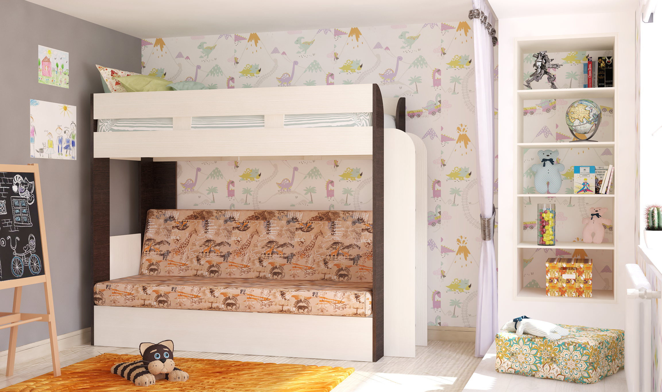 Двухъярусная кровать с диваном на первом уровне очень функциональна и удобно разместится влюбом интерьере.
