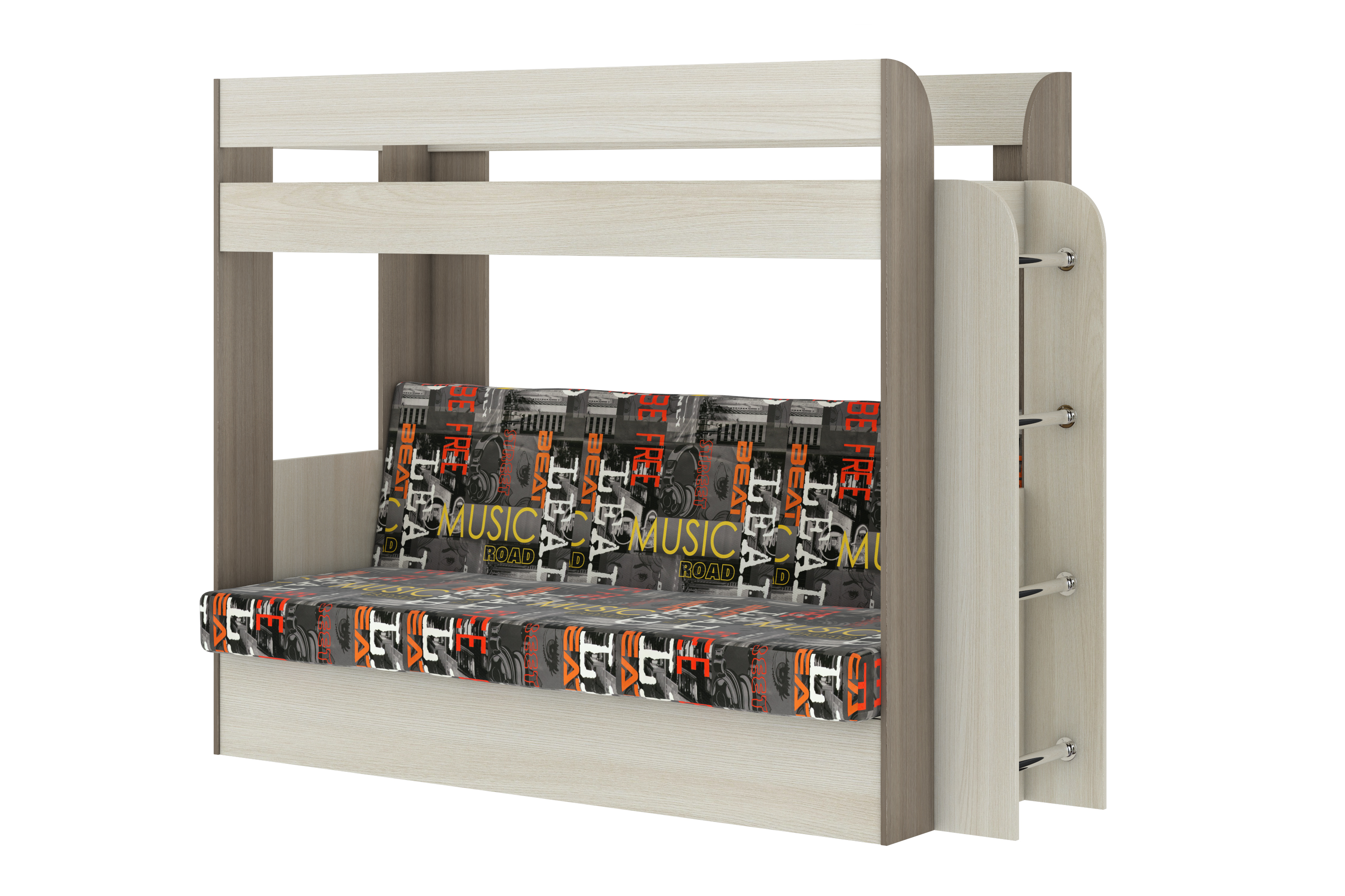 Кровать детская двухъярусная Карамель 75 ясень шимо темный/светлый, диван - велюр Музыка (сборка на любую сторону) спальное место верх 80х190, низ 120х185