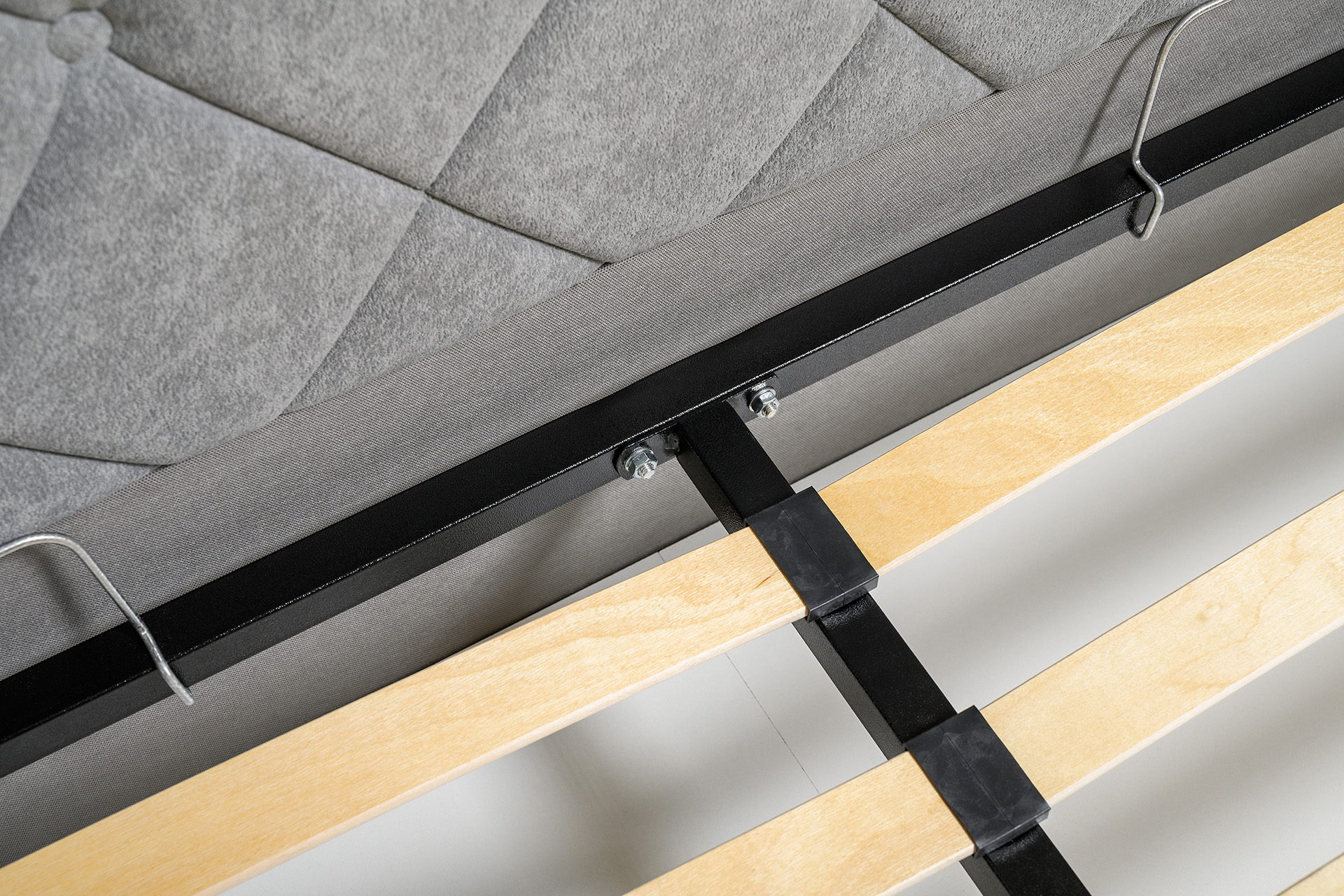 Основание кровати укомплектовано матрасодержателями. Жесткое кроватное дно из ЛДСП 16 мм на опорах 25 мм.