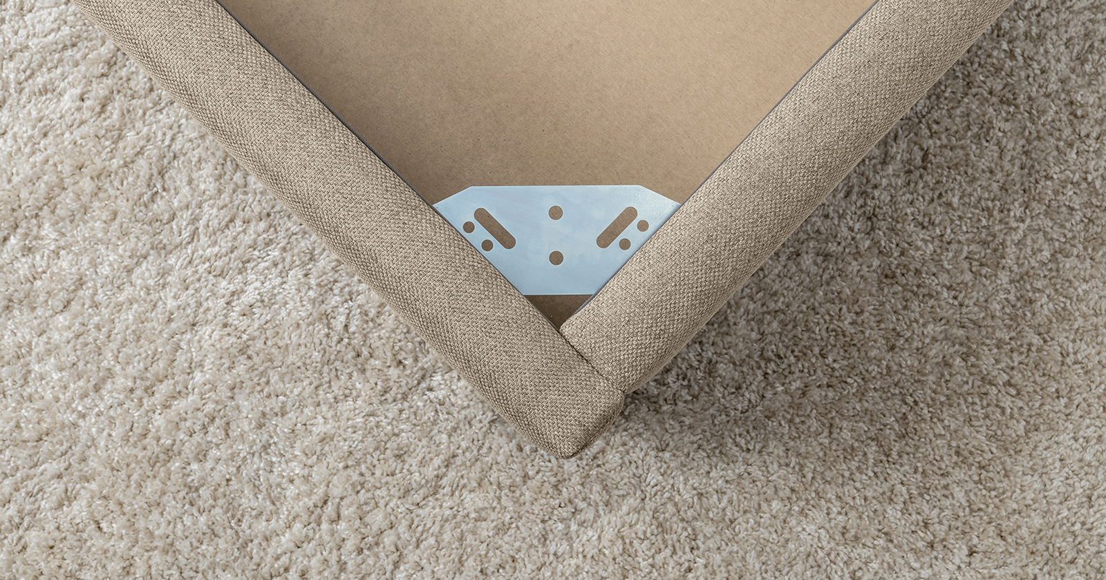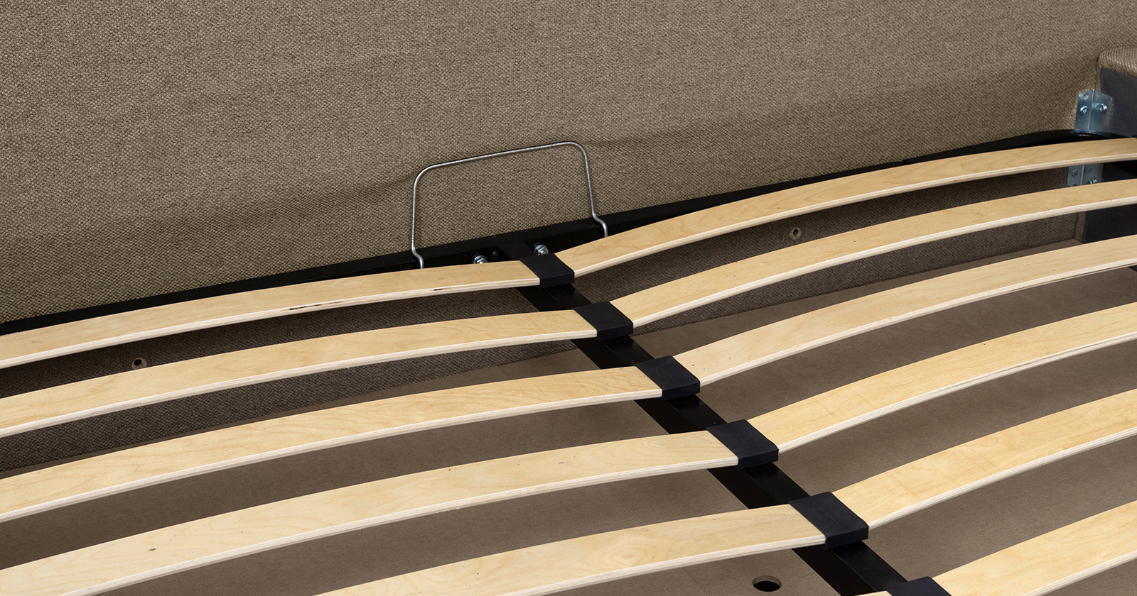 Основание кровати укомплектовано матрасодержателями. Жесткое кроватное дно из МДФ 6 мм. Задняя стенка изголовья выполнена в тех. ткани (спанбонд).