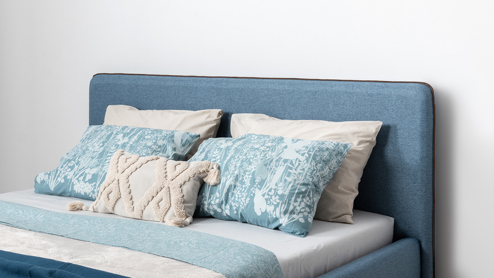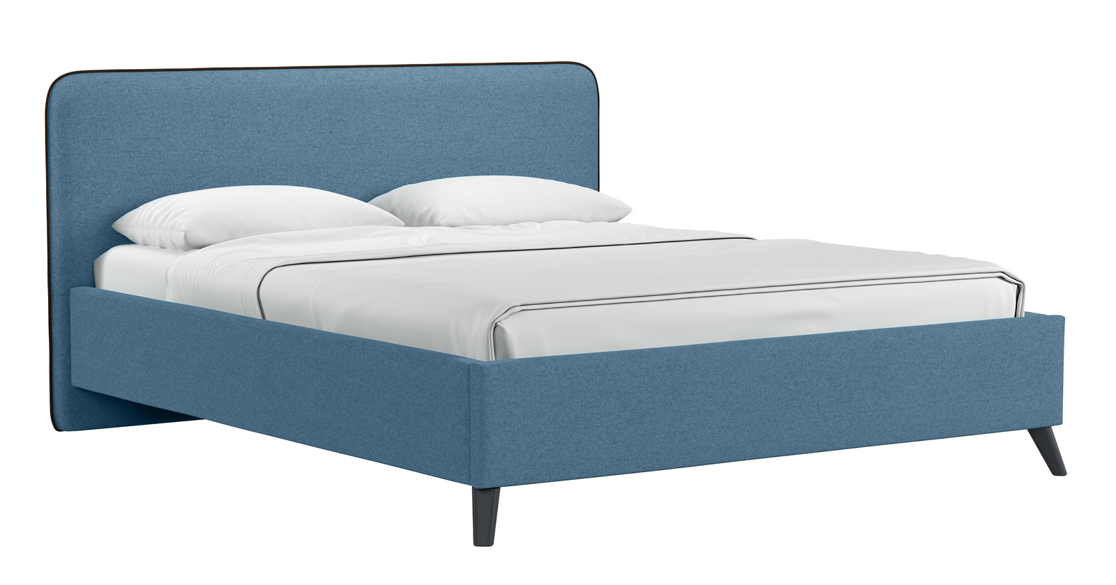 Cкругленный торец изголовья оформлен контрастным кантом.