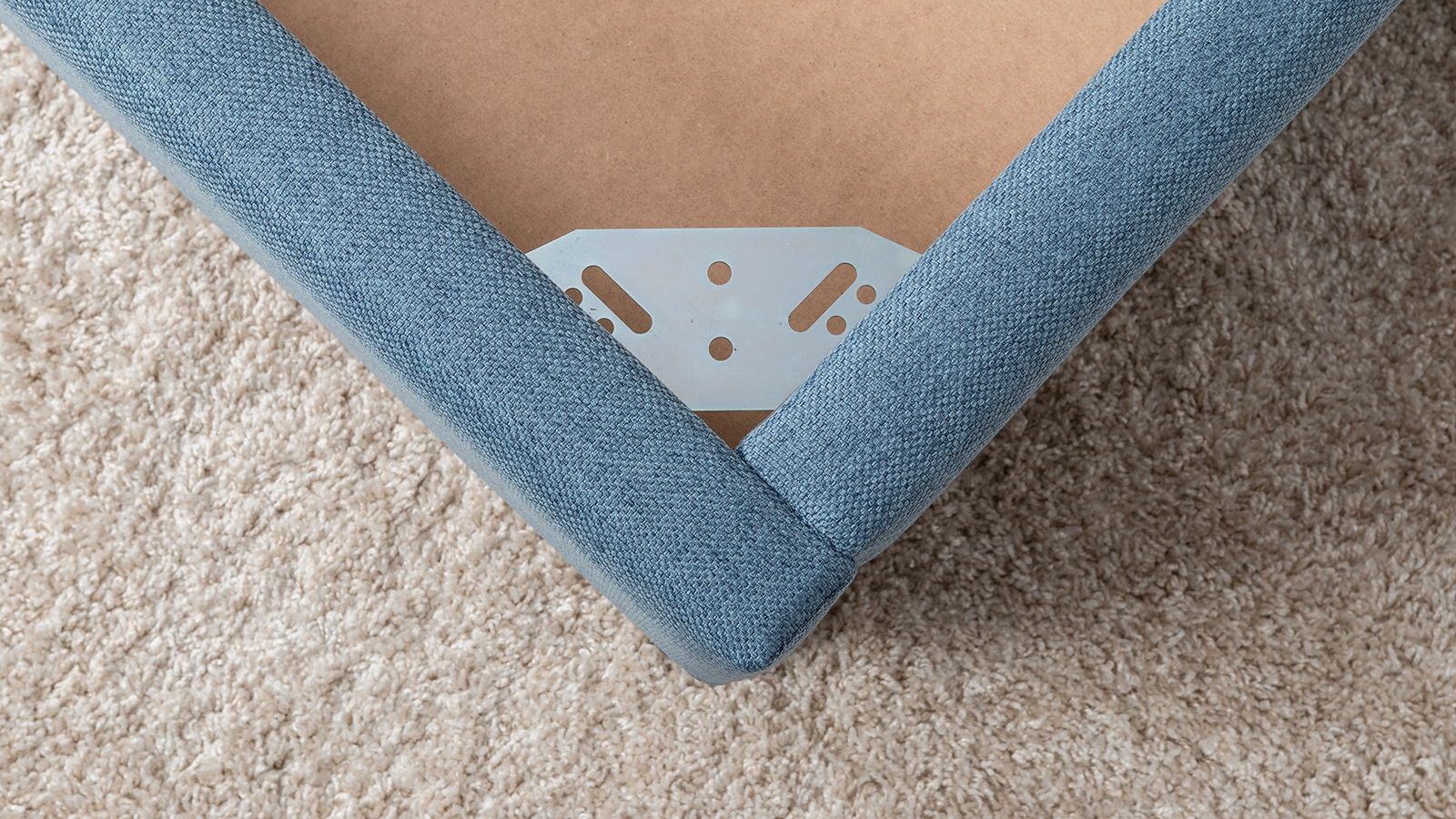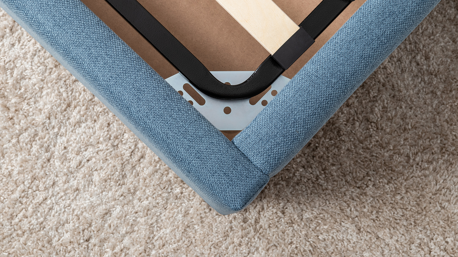 Основание кровати укомплектовано матрасодержателями. Жесткое кроватное дно из МДФ 6 мм. Задняя стенка изголовья выполнена в тех. ткани (спанбонд).