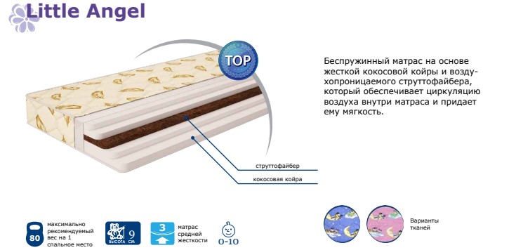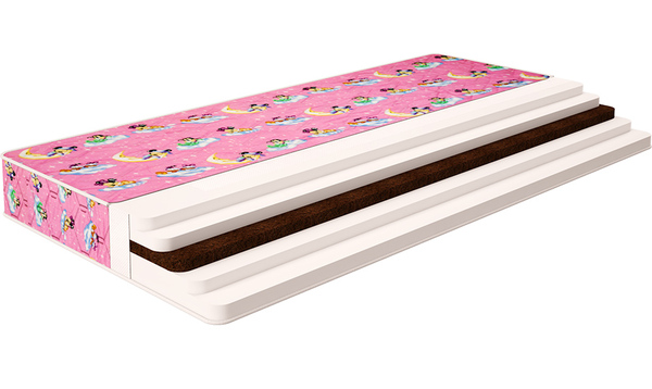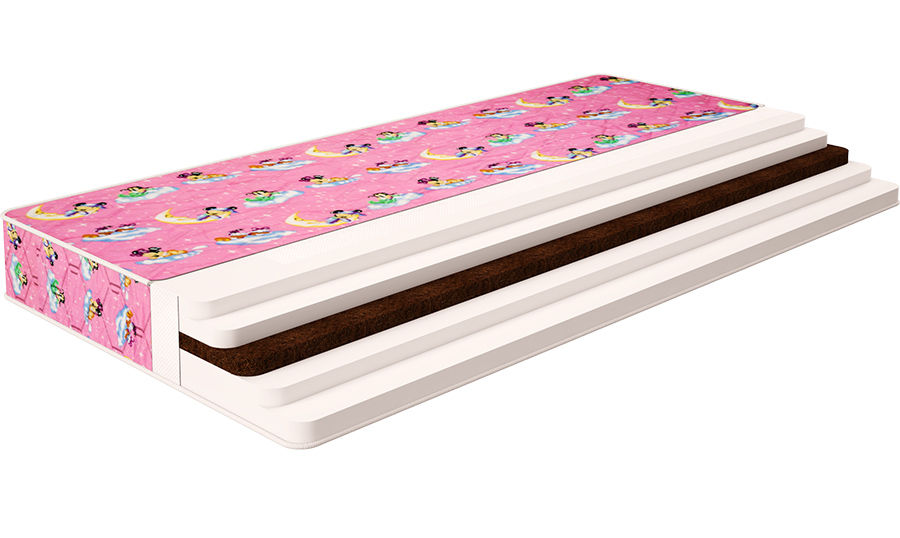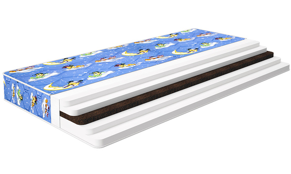 Беспружинный матрас на основе жесткой кокосовой койры и воздухопроницаемого струттофайбера, который обеспечивает циркуляцию водуха внутри матраса и придает ему мягкость.