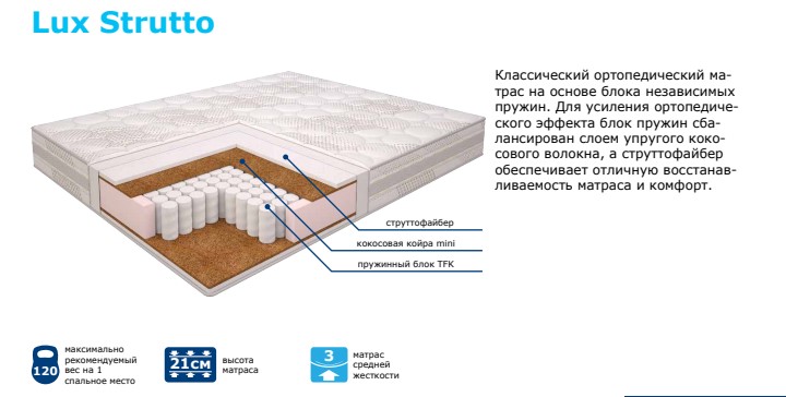 Идеальное сочетание долговечного упругого и прочного кокосового волокна с мягким струттофайбером делают данный матрас комфортным и надежным в эксплуатации.
