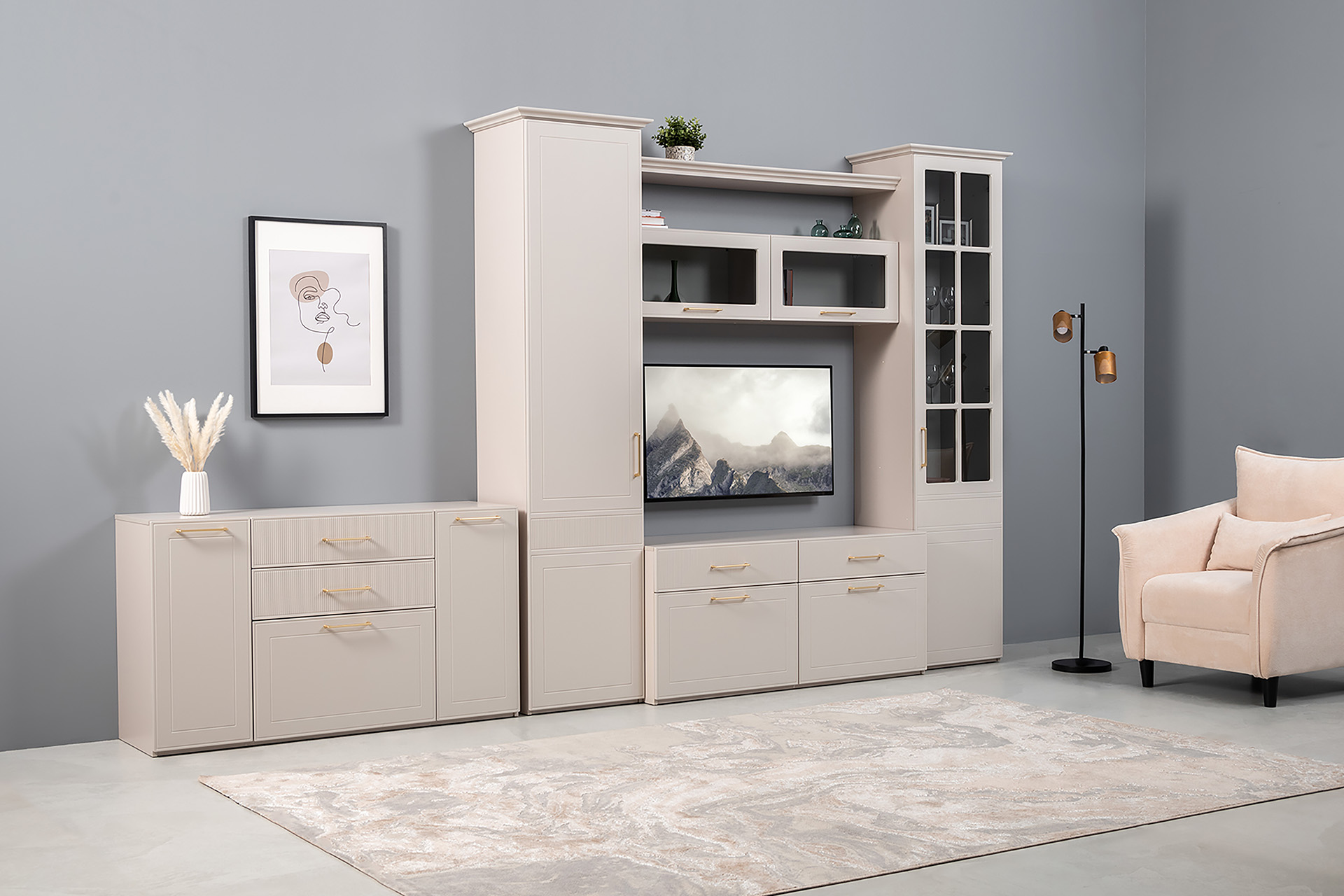 Фрезерованные фасады из МДФ, металлические ручки и витрины с тонированным стеклом создают изысканный образ.