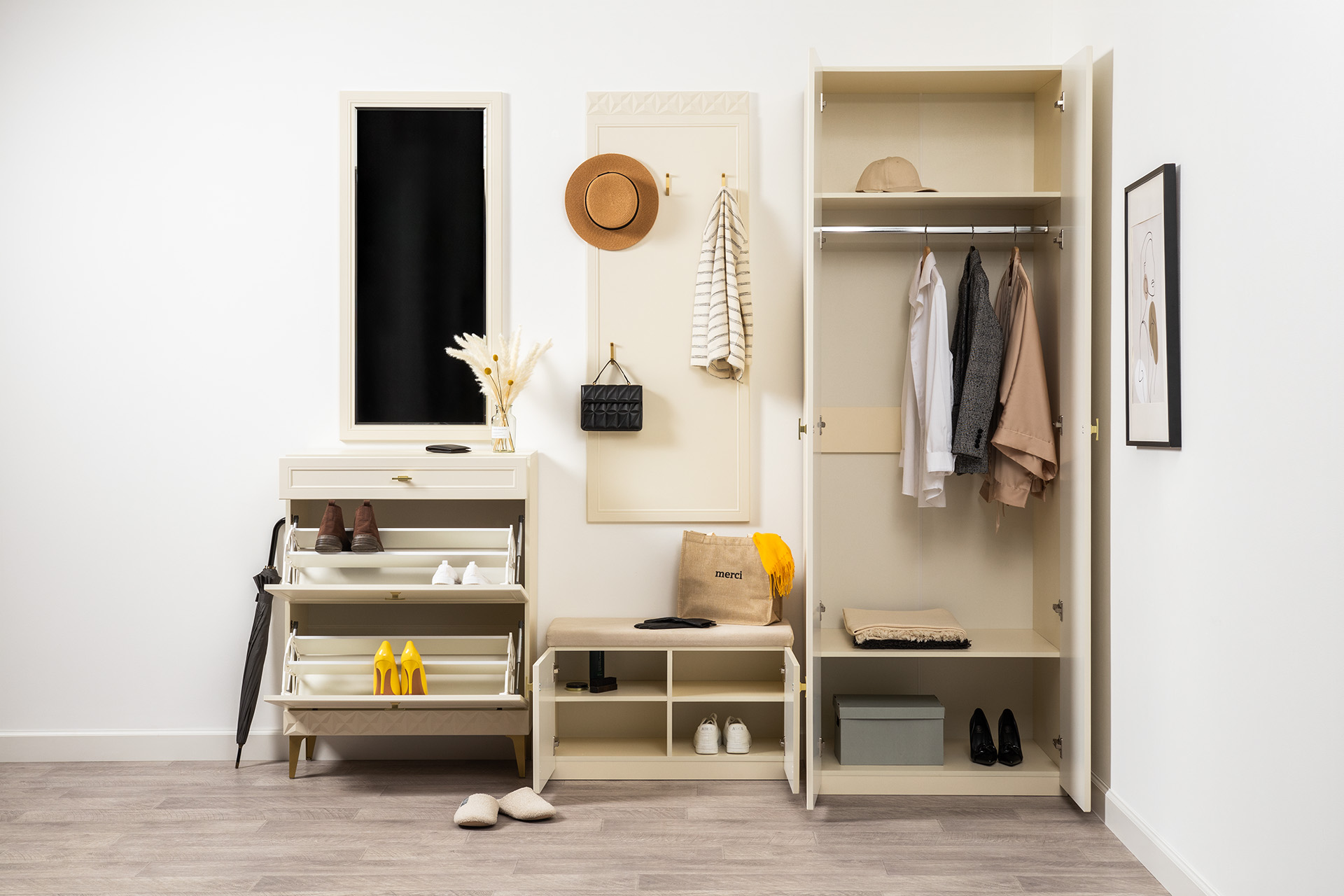 Изящные линии, глубокая фрезеровка фасадов из МДФ и благородные оттенки. Утончённая «Слоновая кость» и изысканная «Олива Шагрень» с глубоким зелёным тоном — создают атмосферу уюта, тепла и благородства. Металлические ручки и опоры золотого цвета придают мебели утончённый блеск, а петли и направляющие с доводчиками обеспечивают плавное и бесшумное закрытие фасадов.