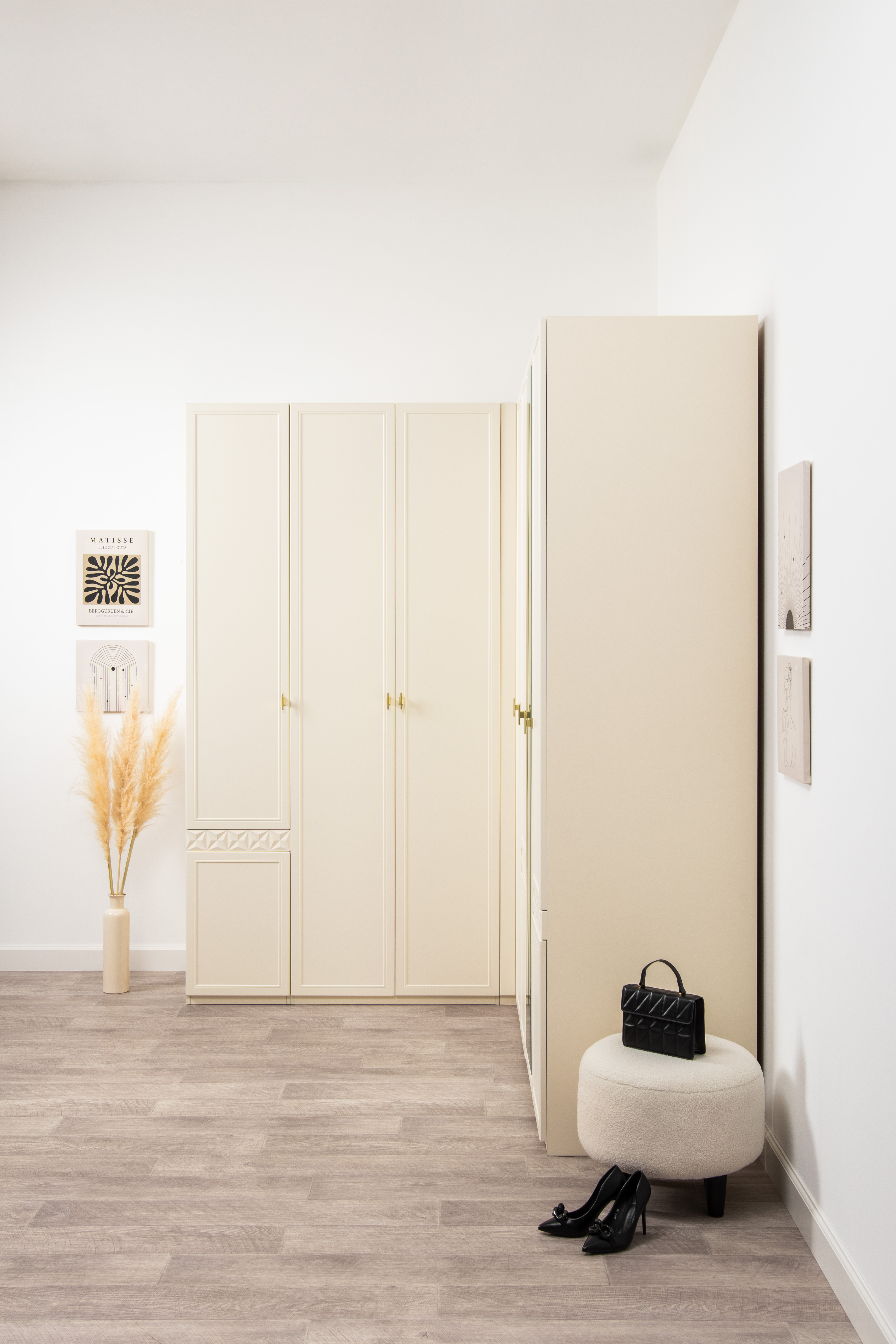 Изящные линии, глубокая фрезеровка фасадов из МДФ и благородные оттенки. Утончённая «Слоновая кость» и изысканная «Олива Шагрень» с глубоким зелёным тоном — создают атмосферу уюта, тепла и благородства. Металлические ручки и опоры золотого цвета придают мебели утончённый блеск, а петли и направляющие с доводчиками обеспечивают плавное и бесшумное закрытие фасадов.