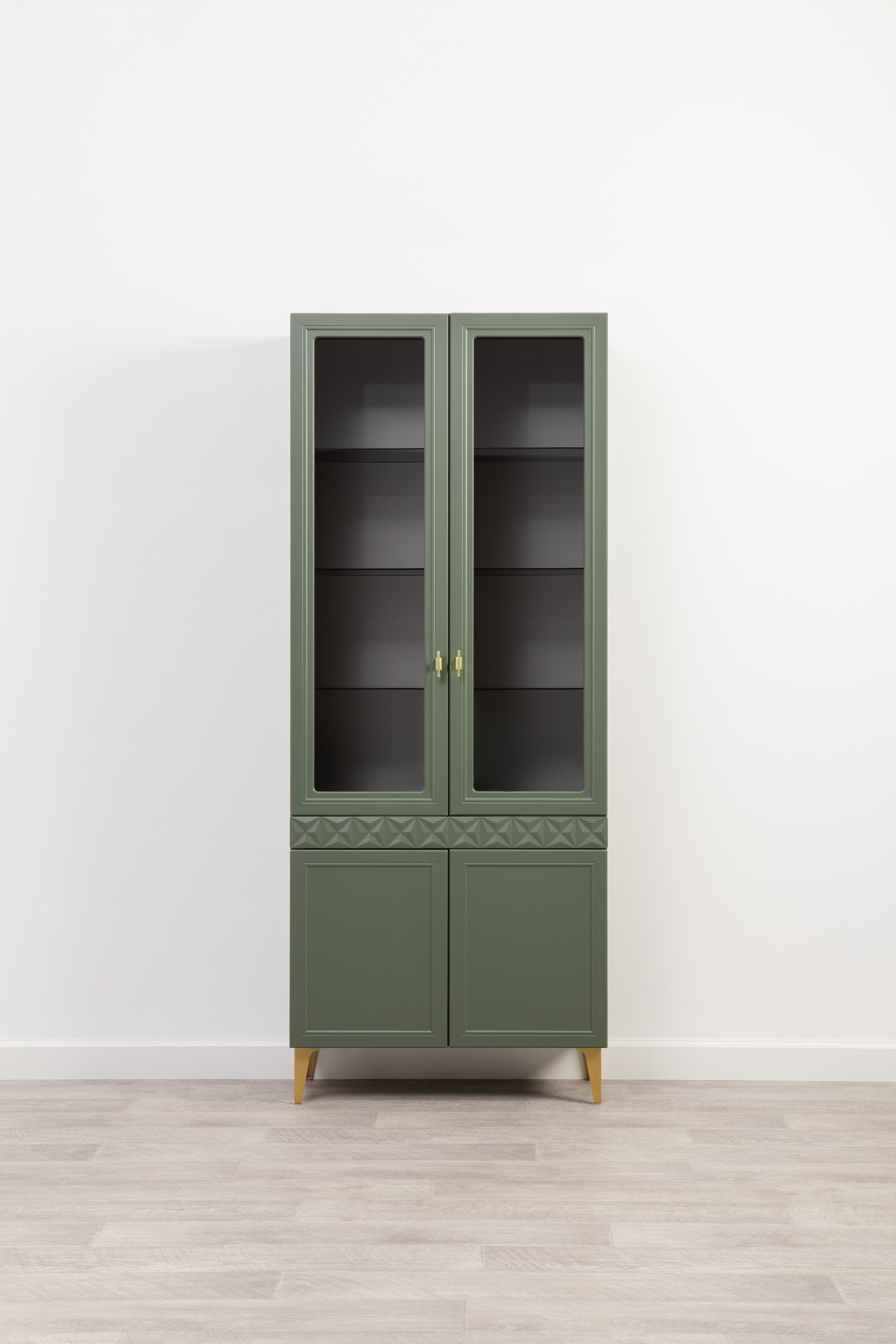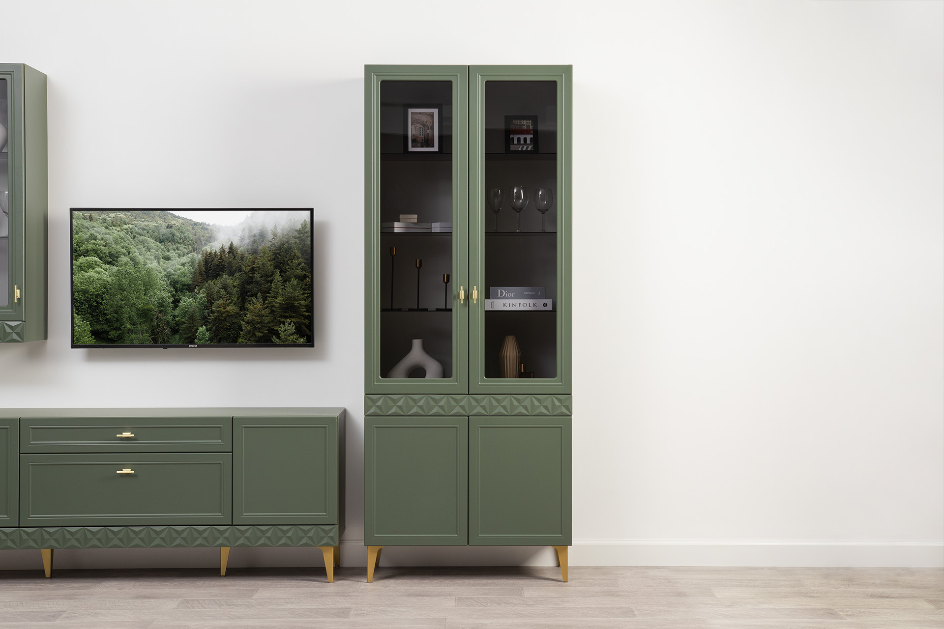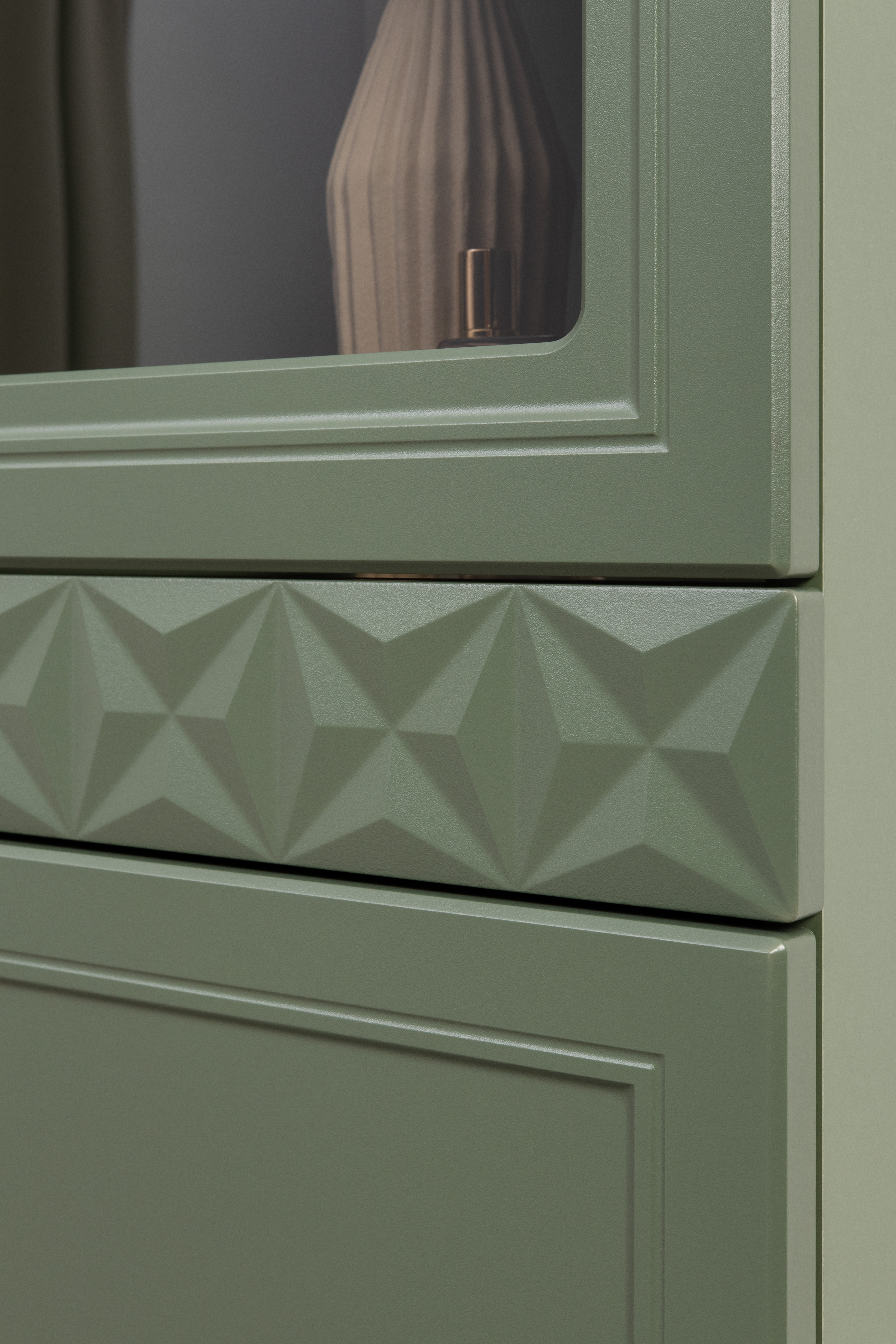 Шкаф-витрина Марион 16.397.02 дымчатый зеленый K521, олива шагрень AG 1050 ПВХ (собирается на любую сторону)